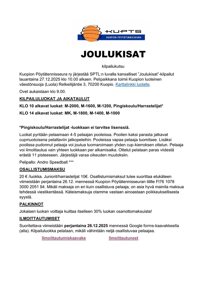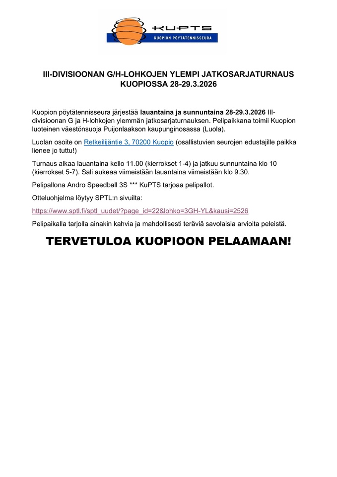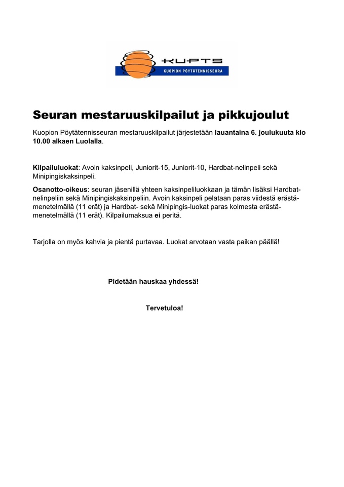 Tervetuloa Kuopion pöytätennisseura ry:n eli tuttavallisemmin KuPTS:in www-sivuille. Sivuilla on tarkoitus tarjota mahdollisimman paljon ja monipuolisesti tietoa seuramme toiminnasta.