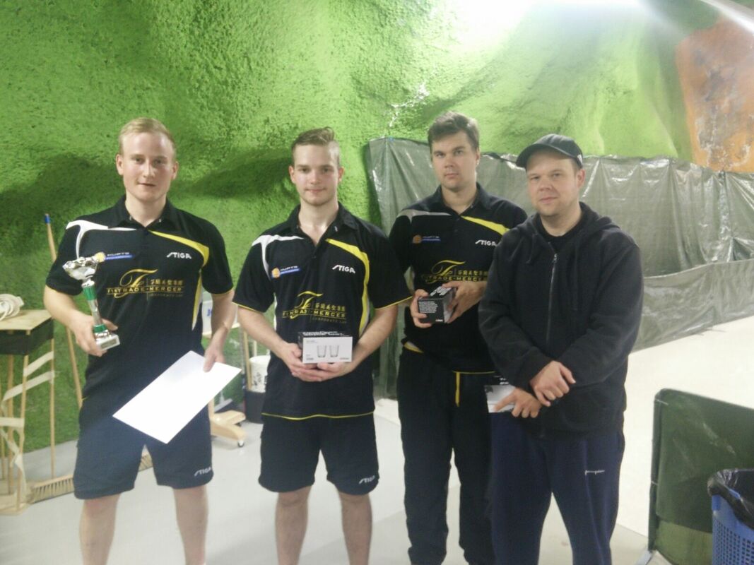 Kuopion Pöytätennisseuran Syyskisat keräsivät hienosti viitisenkymmentä pelaajaa vääntämään Luolaan. Taas saatiin kisat pienestä "pöytäpulastakin" huolimatta aikataulullisesti hyvin läpi ja immeiset kotimatkalle maltilliseen aikaan. Kilpailutavasta osin johtuen kilpailuluokat oli nimetty tylsähkösti "Luokka I, Luokka II" jne. Luokka I:een kelpuutettiin 10 korkeimman ratingin ilmoittautunutta, Luokka II:een 10 seuraavaa...Hirveästi ei ainakaan luolareportterin korvaan tullut kritiikkiä tästä arvontatavasta. Voitaneen todeta, että tämä kuitenkin sopii selkeästi enemmistölle paremmin kuin Luolassa aiemmin käyttämämme Eesti-kaavio. Luokka I: Oops, I did it again! Ei ollut Britney Spears osallistujissa, mutta tämä biisi jäi soimaan päähän ykkösluokan loppuottelun ratkettua. Oli sitten seurana JPT tai nykyään KuPTS, on voittajan nimi jälleen Aleksi Hyttinen. Allu on saamassa jälleen pelivarmuutensa uomiin. Alkupoolissa tosin OPT-86:n Teemu Oinas meinasi olla sitä mieltä, että Hyttisen taival loppuu alkupooliin, mutta kun keskinäinen peli venähti viidenteen erään, ei jatkopaikkaan riittänyt edes Teemun hyvä voitto. Tämä siksi, että Allu oli voittanut jäsenten välisessä 3-1 erin Miko Haaralan, joka puolestaan kampesi semeihin voitettuaan 3-1 voitolla Teemusta. A-poolin kiemurat jäivät aika vähäisiksi lopulta B-pooliin verrattuna. Siinäpä sitä pelailtiin huolella ristiin ja toimitsijapöytä kiitti laskemalla. Petter Punnonen osoitti jälleen nousujohteista peliä ja varmalla tekemisellään kellisti niin korkeamman ratingin seurakaverinsa Jyri Pulkkisen kuin Iivari Hartikaisenkin sekä MPS:n Sami Hattusen. Vielä voi vähän Peten jalkoja sentään saada maahan, sillä poolin ykkössijasta huolimatta tuli ruksi tappiosarakkeeseen JysRy:n Henry Laasasen toimesta. Toisena semeihin paukautti lopulta poolin ykkössijoitettu Jyri. Semit menivät kohtalaisen selkeästi seuran Joensuun haarakonttorin pojille. Miko oli Petelle ekassa erässä 3-9 alla, kampesi 10-9. Vain hävitäkseen erän. Peten tämän päivän varmuus riitti Mikoa vastaan: 3-1. Samat olivat lukemat Allun ja Jyrin semissä. Loppuottelussa Allu tunsi treenikaverinsa metkut ja Peten eväät voiton osalta oli syöty. Selkeä 3-0 Aleksille ja (huokaus!) jälleen Luolalla joensuun epeli nosti voittopokaalin! Onnea Aleksille! Luokka II: YPTS ajaa pingiskartalle ohituskaistaa! Ylivieskassa on pingisbuumi, josta saimme Luolassa viitteitä. Parista poisjäännistä huolimatta pikkubussi toi YPTS-paitaisia pingisintoilijoita hyvän nipun kisoihin. Eikä kisaa ilman menestystä. Kakkosluokan nimittäin rouhi vasurivenkuroillaan kovaksikeitetty pelimies Pekka Korva, jonka kanssa luolareportterikin on vääntänyt tiukkoja matseja jo luvulla Mark V ja Sriver. Jottei tälläkään kertaa ihan hunajan valutukseksi menisi todetaan, että täyden duunin joutui Pekka voittonsa eteen tehdä. Loppuottelussa taipui neljässä erässä PiPy:n Markku Halonen, joka vielä alkupoolissa pehmeni Pekan viisieräisessä "Finaalin esiottelussa". Kolmansiksi palloilivat Savonlinnan Jouni Koskela sekä JPT:n Heikki Holopainen. Luokka III: Kun Riemulla ei ole mitään rajaa! Kolmostuo...luokan voitto puolestaan karkasi Jyväskylään. Liikunnan Riemun Toni Ruokanen pelasi luokan alusta loppuun puhtaalla pelillä. Loppuottelussa Nurmeksen nuori Santeri Korhonen pisti Tonin ahtaalle ja ratkaisua saatiinkin hakea viisi erää. Pronssit LiPi:n Shaho Jaffin ja KuPTS:in Lauri Wemanille. Luokka IV: voittajan nimi Kokkonen eikä kakkonen! Luokka IV oli kisajärjestäjien positiivinen murheenkryyni. Ajatus kahdesta poolista saatiin dumpata roskakoriin kun kisailmoittautumisia tihkui enemmän kuin odotettiin. Niinpä Luokka IV pelattiin muista aikuisten luokista poiketen neljässä alkupoolissa ja jatkopelit 8 pelaajan jatko-cupina. Toinen kisojemme vakiovierasseura, Nurmeksen Sepot, saivat Santerin hopean lisäksi myös luokkavoiton kun Erkki Kokkonen pyöritti lopulta loppuottelussa kolmessa erässä IPT-94:n nuoren Simo Teron nurin. Iisalmen lupaus oli semissään tiputtanut loppuottelusta luokan ykkösreitatun PiPy:n Jari Kohvakan. Kokkonen suisti puolestaan kakkossiidatun Martti Knuutisen voittoraiteilta. Junioriluokka: Santeri Korhonen junnupuolella omassa kastissaan! Junioriluokka pelattiin kuuden pelaajan poolina. Nurmeksen Santeri Korhonen oli omaa luokkaansa hoitamalla viisi ottelua ilman erätappioita. Lyhyesti ja ytimekkäästi. Yhtä hyvä kakkonen oli Iisalmen Tero, siis Simo, joka tosin sai toisen polven pingispelaajan, OPT-86:n Janina Ågrenin kanssa tehdä täyden päivätyön. Kuopiolaisjunnut jäivät tällä kertaa hännille, mutta työ jatkuu! Kisat siis nipussa, raportti naputeltu ja Luola siivottu valmiiksi odottamaan ensi viikon treenikarkeloita. KuPTS kiittää jälleen lämpimästi kaikkia kilpailuihin osallistujia! Osallistujamäärä osoitti, että tällaiselle kilpailutapahtumalle on yhä tilausta, vaikka toki toivomme jatkossa kykenevämme järjestämään suurempiakin kisoja entisvuosien tapaan. No, keväällä on ainakin yhdet isot skabat tiedossa Kuopiossa! ps. videokuvaa Luokan I ratkaisuotteluista tulossa! |