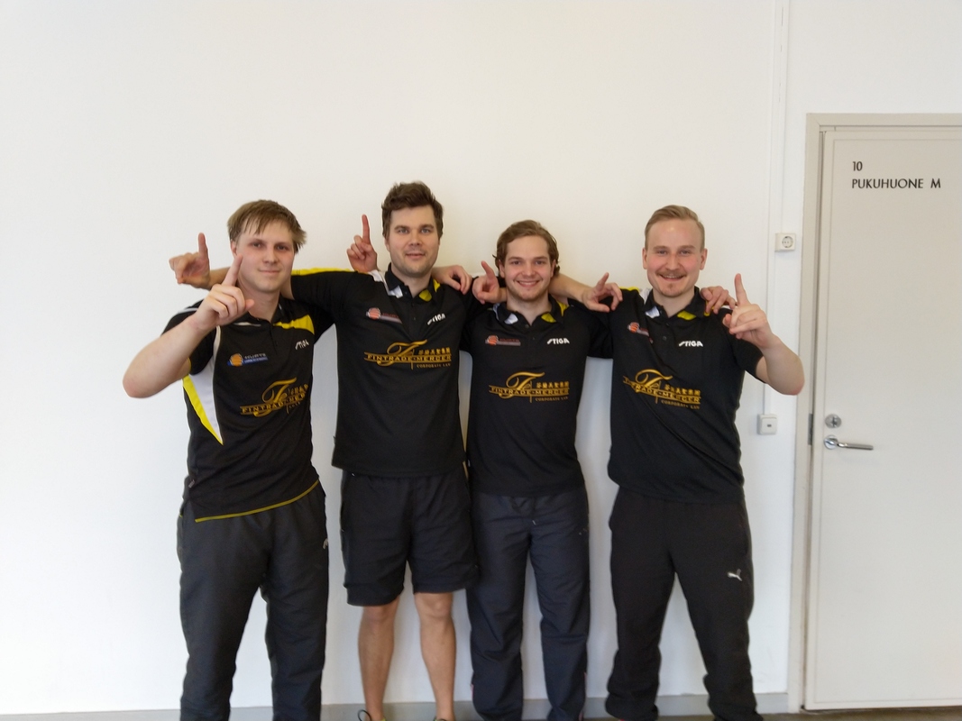 Kuopion Pöytätennisseuran joukkueet tekivät melkoisen tempun tänään Helsingissä pelatussa I-divisioonan karsintaturnauksessa. Sekä ykkös- että kakkosjoukkueemme kierteilivät sen verran menestyksekkäästi, että molemmat varmistivat paikan I-divisioonaan kaudelle 2019-2020. Turnaus pelattiin ns. ”Progressive knock-out” kaaviolla, jossa kahdeksan joukkueen kesken varmistui paikka ykkösessä kahdella otteluvoitolla. Ykkösjoukkueemme jatkoi tappiotonta kauttaan loppuun saakka peittoamalla ensin vantaalaisen TIP-70 5:n ja toisessa ottelussa oululaisen OPT-86 2:n. Kakkosjoukkueemme taivalsi divaritikettinsä eteen hieman pidemmän kautta, sillä ensimmäisen kierroksen voiton hyvinkääläisestä HUT:sta jälkeen seurasi tappio ykkösestä karsimaan joutuneelle Helsingin Wegalle. Kolmannessa ottelussa samaisen Wegan 2-joukkue taipui kuitenkin kuopiolaisille ja tuplatriumffi oli todellinen! 1. karsintakierros: KuPTS - TIP-70 5: 4-0 Ykkösjoukkueemme pojat aloittivat turnauksen vakuuttavasti. Tippiläisten vitosjoukkue oli vastaantulija, eikä ”vierasjoukkueelle” annettu ensimmäistäkään otteluvoittoa. Toki hieman kiusaa tekivät tikkurilaiset venyttämällä kaksi ottelua viisieräisiksi. Niissä Jyri Pulkkinen ja Aleksi Hyttinen olivat kuitenkin lopulta selkeästi vahvempia Patrik Boxströmiä ja Jukka Ovaskaa vastaan. Hyvän lisän toi Petter Punnonen ottamalla maukkaan revanssin III-karsintatappiolleen Marek Viskmanista.