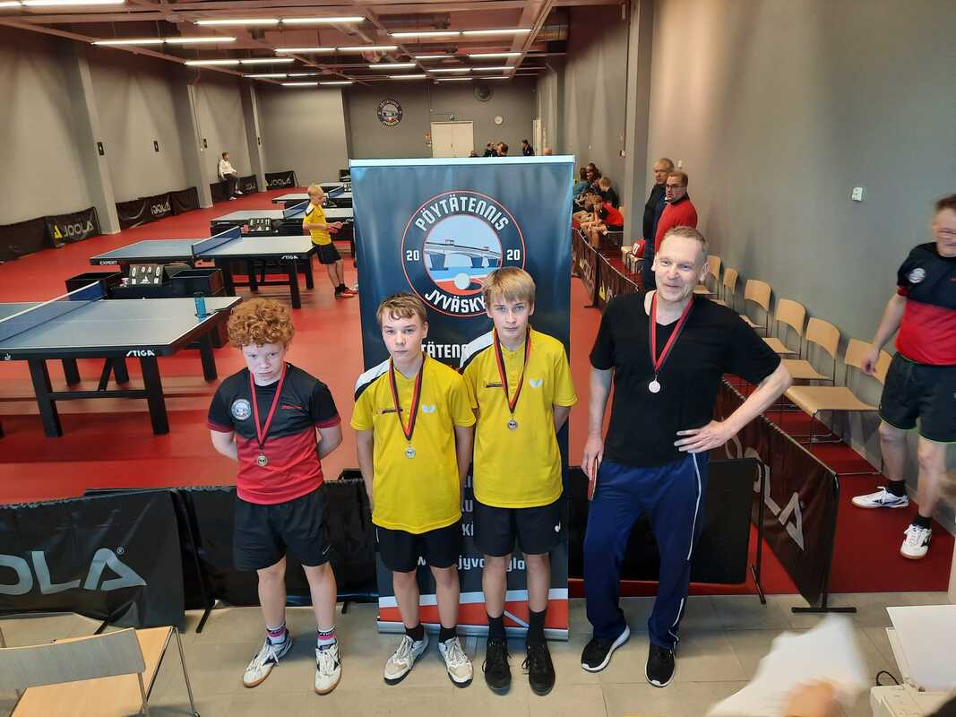 Jyväskylän kansalliset Syyskisat tarjosivat jälleen mitalisadetta Kuopion Pöytätennisseuran edustajille. Suurimman voittotilin summasi Niko Hämäläinen voittamalla peräti 17 kaksinpeliotteluaan kisojen aikana. Varovaista paluuta kilpakentille tekevä Sami Kokkonen puolestaan hoiteli miesten pääluokan ykköstilan. Kaksipäiväisten kilpailujen lauantaissa Niko Hämäläinen voitti M1300-luokan kaataen tiukasti isäntäseuran Olavi Moilasen viisieräisessä loppuottelussa. Samassa luokassa myös Konsta Leppänen pelasi pronssille (häviten Nikolle). Niko pelasi junioriosastomme kaartista parhaiten myös M1500-luokassa. Tappio tuli niin alkupoolissa kuin loppuottelussakin MPS:n Timo Juutiselle, mutta jo loppuottelu oli tiukempi selkeästi korkeammin rankattua mikkeliläistä vastaan. Lauantain lisäksi Konstan isä Juha Leppänen avasi kilpauransa mukavasti, sillä poolina pelatussa M1100-luokassa tuli hopeatila kolmella voitolla neljästä ottelusta. Sunnuntaina junioripitoiseen osallistujakatraaseemme liittyivät myös Sami ja Noel Kokkonen sekä Juha Kulju ja Terho Pitkänen. Noel on viime ajat satsannut pesäpalloon, mutta hyvin pysyy pelissä myös pingispallo ja M1000-luokasta tuliaiseksi tuli pronssimitali. M1200-luokassa sai lauantain mitalitta pelannut Elmeri Räsänen myös arvomitalisijan pelaten luokan loppuotteluun. Tuttu vastustaja Jyväskylän Olavi Moilanen tosin vei luokkavoiton 3-2 erin. Sitten hetki taas Hämäläisen Nikon suitsutusta: M1400-luokassa alkupooli tappioitta ja kruisailu luokkavoittoon. Moilasen Olavi kiusasi Nikoa semissä kaksi erää, mutta loppuotteluun noussut toinen kuptsilainen Konsta ei kyennyt erävoittoon. Kultaa Nikolle, hopeaa Konstalle ja pronssia Juhalle! M1600-luokassa Niko voitti poolinsa tappioitta alimmalla siidauksella. Jatkocupiin eteni jälleen myös Konsta. Semissä pojat jälleen vastakkain ja jälleen voittajana Niko. Ihan päätyyn asti ei tällä kertaa kantanut lento, sillä alkupoolissa nöyrtynyt monille tuttu peluri Markku Halonen sai lyöntipelinsä parempaan tikkiin ja lopulta tuuletti luokkavoittoa 3-2 lukemien myötä. Hopea ja pronssi Kuopioon. Miesten pääluokassa ei kuopiolaisia ollut mukana kuin Sami Kokkonen, mutta laatu korvasi määrän. Entinen kansallinen huippupelaajamme hallitsi pelitapahtumia ja kuittasi luokkavoiton poolina pelatusta pääluokasta ilman tappioita. Pari erätappiota jätettiin vastustajille muistoksi. Kilpailutulokset: Jyväskylän Syyskisat (lauantai) Kilpailutulokset: Jyväskylän Syyskisat (sunnuntai)