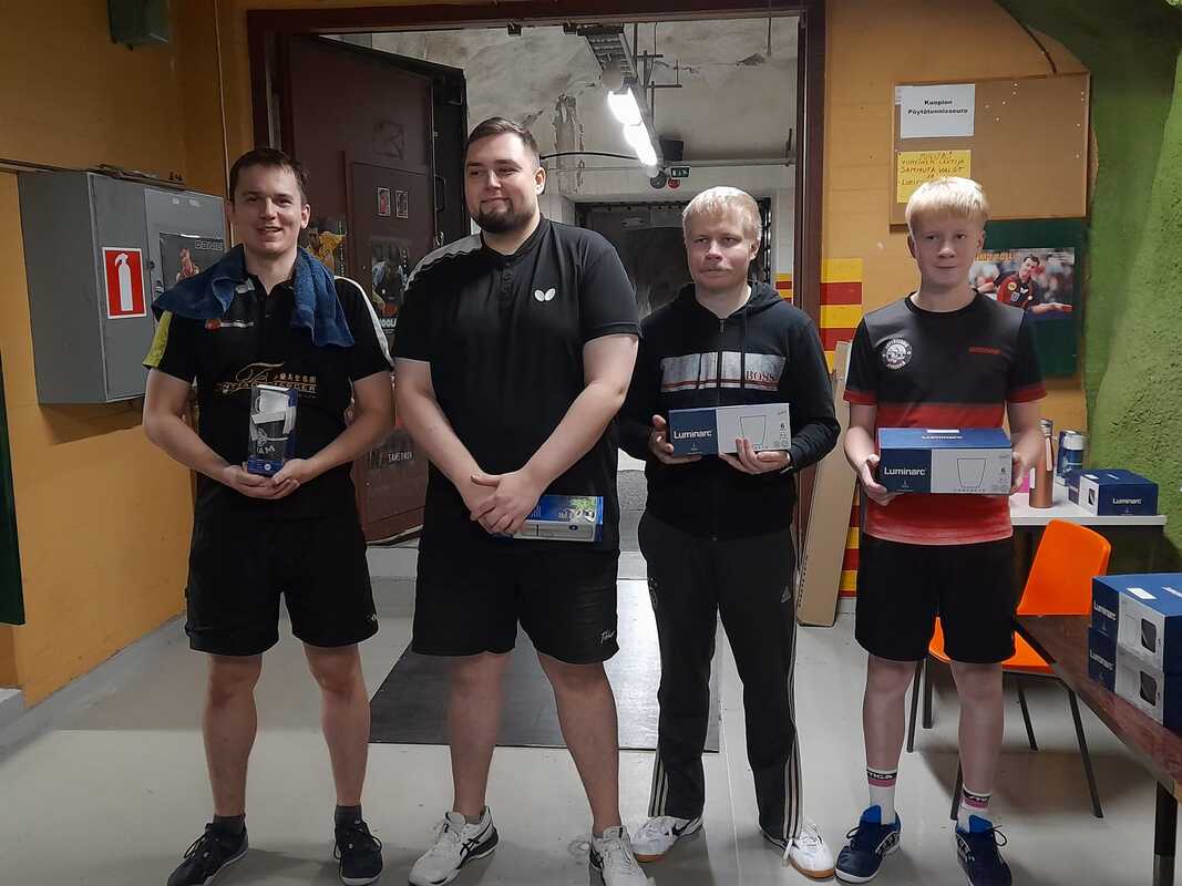 Miesten kaksinpelin mitalistit: Aukusti Kontkanen (2) KuPTS, Maxim Nesterov (1) KuPTS, Heikki Holopainen (3) JPT, Severi Sipiläinen (4) PT Jyväskylä