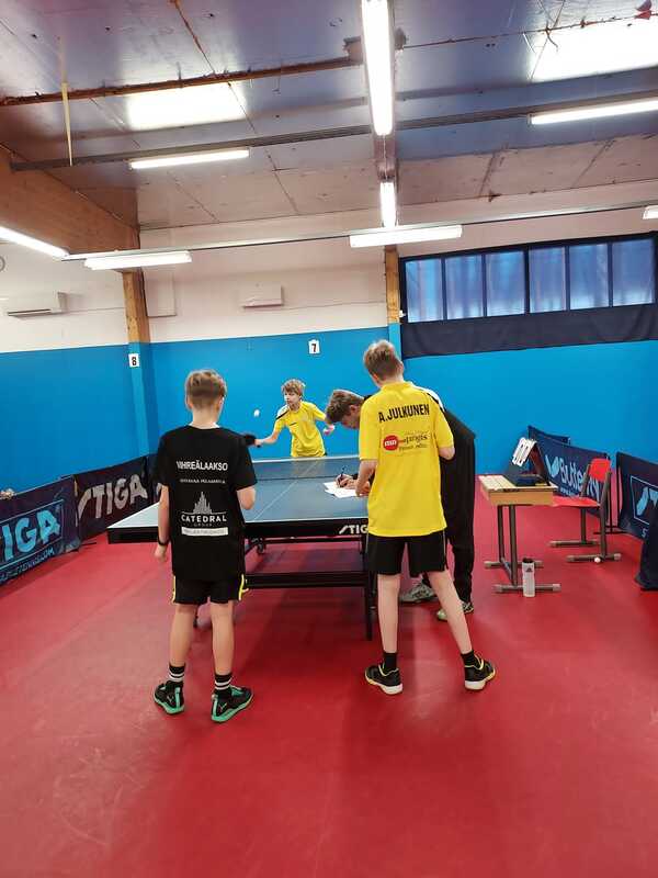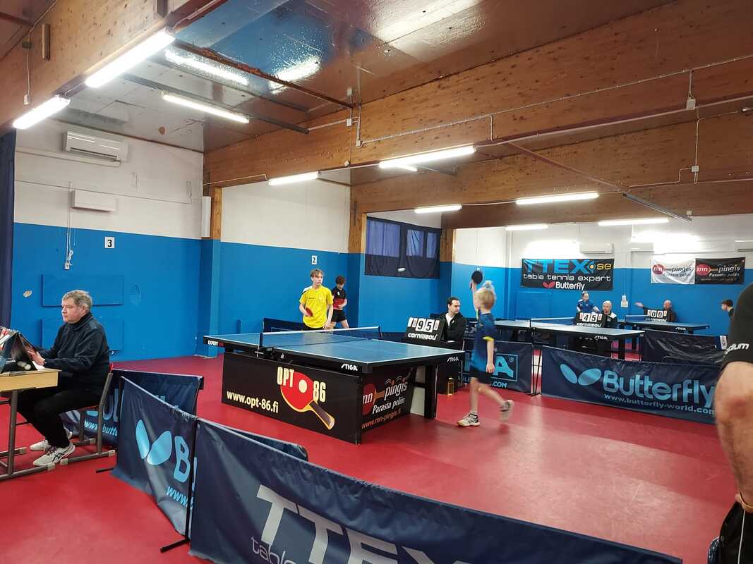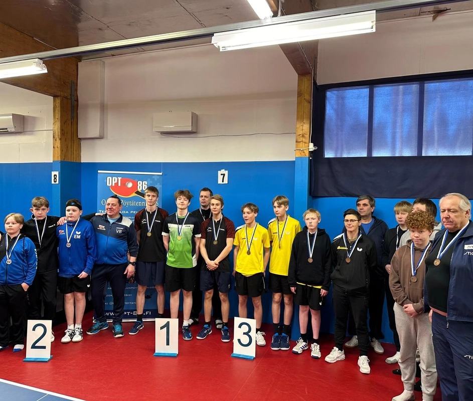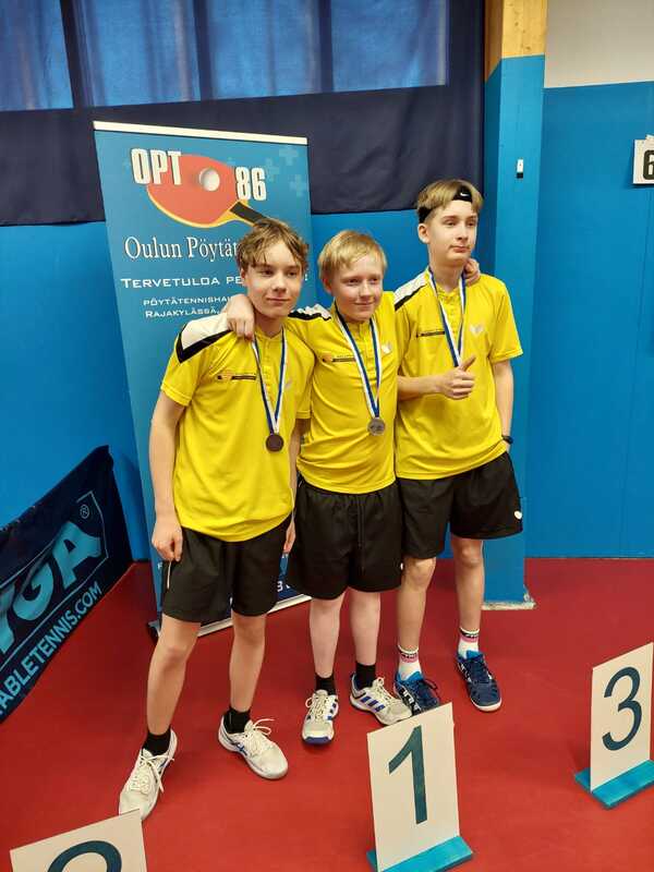 Muut mitalisijat tulivat joukkuekilpailuissa. Identtisenä sekä 13- että 15-vuotiaiden joukkuekisassa seuramme ykkösjoukkueena Hämäläinen, Elmeri Räsänen sekä Konsta Leppänen etenivät 13-vuotiaiden joukkuekisan loppuotteluun. Tässä luokassa loppuottelussa kisajärjestäjän oululaisen OPT-86:n ykkösjoukkue oli 3-0 lukemin parempi, vaikka otteluista etenkin Nikon kohtaaminen Eetu Mäkelän kanssa oli äärimmäisen tiukka. 15-vuotiaiden joukkuekisassa taso on luonnollisesti hieman kovempi. Tästä huolimatta ykkösjoukkueemme selvitti tiensä mitalipeleihin toistamiseen. PT Espoo kovan ykkösensä Lassi Lehtolan johdolla vei kuitenkin pidemmän korren 3-0 voitoin. 13-vuotiaiden kaksinpelissä Niko sai lopulta revanssin Oulun Mäkelästä. Finaalipaikka oli varmistunut äärimmäisen tiukalla 3-2 voitolla Ylivieskan Pyry Sivenistä ja myös hyvätasoinen loppuottelu oli jännä. Niko osoitti kovia hermoja ja varmaa palautuspeliä ja lopulta viides erä ja kulta ratkesivat Eetun lyöntivirheeseen ja kuopiolaisjoukot saivat tuulettaa. Miesjunioreiden SM-mitaleja ei ihan turhan usein ole Kuopioon saalistettu. Edellinen 13-vuotiaiden kuopiolaismestaruus on vuodelta 1976, jolloin Jouko Nuolioja pelasi mestariksi. Juniorityömme laadukkuus alkaa näkyä mukavasti myös kansallisella arvokisatasolla. Nikon lisäksi Elmeri Räsänen, Konsta Leppänen, Akseli Julkunen, Toivo Halmepuro, Noel Kokkonen sekä Leevi Kauppinen ottivat kaikki viikonlopun aikana mukavasti henkilökohtaisia otteluvoittoja ja samalla kirittävät toisiaan entistä kovemmalle tasolle. Kuopion Pöytätennisseura onnittelee paitsi upeasti pelanneita junioripelaajiaan ja mestari-Nikoa myös taustaryhmää: valmentajien Sami Kokkosen ja Katja Kohosen tuuletukset kumisivat koti-Kuopioon saakka. Lisäksi Juha Leppänen ja Juha Kulju tekevät junnujen eteen epäitsekkäästi valtavan määrän työtunteja. Vielä on kautta jäljellä! Mihin nämä vesselit vielä ehtivätkään? Tulokset: Joukkuekisat 13- ja 15-luokat Tulokset: Kaksinpeliluokat
