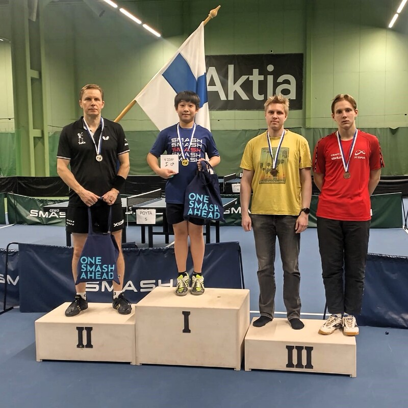 Jouni Nousiainen vastasi parhaasta kuopiolaissuorituksesta A- ja 21-vuotiaiden luokkien Suomen mestaruuskisoissa. Helsingissä viikonvaihteessa pelatuissa kilpailuissa Nousiainen nousi pronssille kaksinpeliluokassa. Mitali Kuopioon varmistui jo puolivälierävaiheessa kun Jouni kohtasi seurakaveri Niko Hämäläisen. Nousiainen näytti että kokemus on vielä valttia ja eteni mitalipeleihin 3-1 voitolla. Välierissä Turun Juha Äänismaa oli kuitenkin vahvempi samoin eräluvuin. Kaikki kolme kuptsilaista pääsivät alkulohkosta pääkaavioon. Niko siis pääsi puolivälieriin, Elmeri Räsänen voitti hienosti alkulohkossaan MBF:n Andrei Räisäsen ottaen hyvän ratingvoiton, mutta jatkossa tie tyssäsi PT 75:n Joel Koivumäkeä vastaan. Miesten nelinpeliluokassa Jouni ja Niko etenivät niin ikään alkulohkosta jatko-otteluihin saaden hyvän kaaviopaikan. Tämä ei kuitenkaan auttanut, sillä mitaleille olisi vaadittu voitto MBF:n Onni Farin / Sisu Sammalkorpi-kaksikosta, mutta helsinkiläiset veivät voiton 3-1 erin. Kilpailuissa pelattiin myös alle 21-vuotiaiden SM-mitaleista niin kaksin- kuin nelinpelissä. Niko Hämäläinen ja Elmeri Räsänen selvittivät hienosti tiensä pääkaavioon kaksinpelissä, mutta kovatasoisessa luokassa tuli kummallekin nopea putoaminen. Elmeri putosi KoKa:n Matias Vesalaiselle 0-3 erin ja samoin erälukemin PT 75:n Jimi Koivumäki pullautti Nikon ulos. Nelinpelissä Nikon oli tarkoitus pelata PT Espoon Joonas Kokon kanssa, mutta Joonas oli estynyt osallistumasta kisoihin, jonka myötä Nikollakin jäi nelinpeliluokka lopulta väliin. |