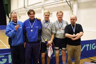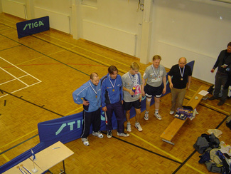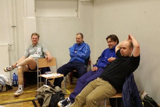 ![]() Ottelun jälkeisissä tunnelmissa Esa Miettinen, Miko Haarala ja Alpo Tenhunen. | ![]() Pronssijoukkue: Miko Haarala, Marko Holopainen, Jani Kokkonen, Esa Miettinen sekä Olli-Ville Halonen. |