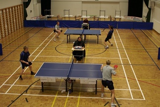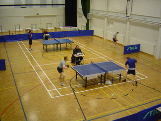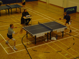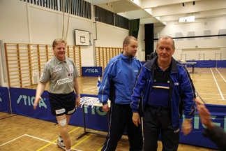 ![]() Esa Miettinen - Jani Jormanainen. Taka-alalla Arto Pelli - Miko Haarala. | ![]() Esa Miettinen lyö ja Jani Jormanainen valmiina palauttamaan. |